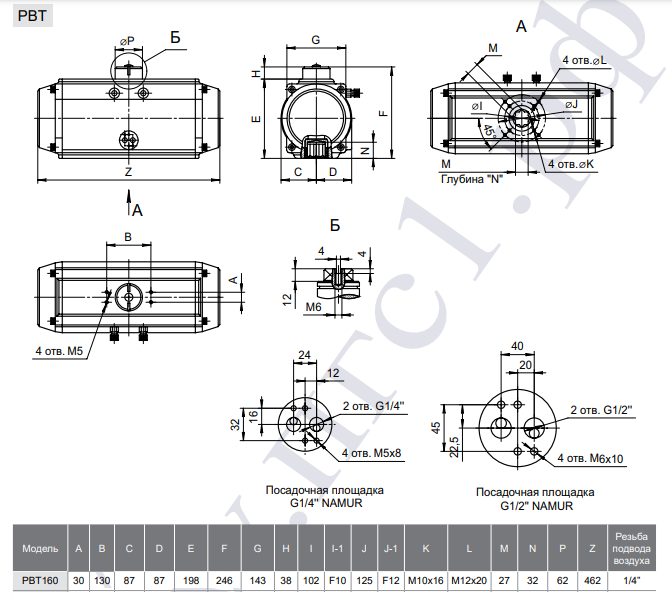 Габаритные и присоединительные размеры пневмопривода PBT160D