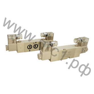 Управление: Электропневматическое, осуществляется при помощи электромагнитных катушек. Катушки имеют напряжения питания 12 VAC, 12 VDC, 24 VAC, 24 VDC, 110 VAC, 220 VAC. В зависимости от модели, распределители имеют одностороннее или двухстороннее управление.